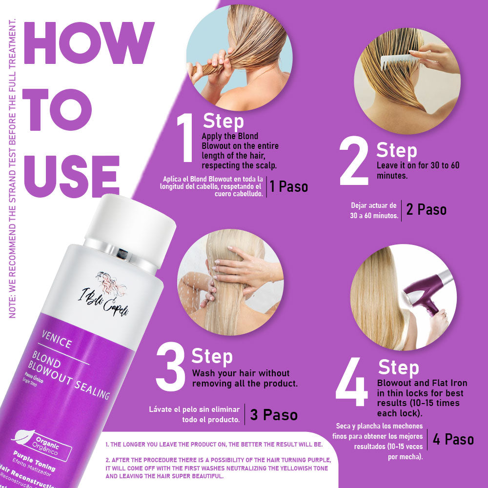 2. After the procedure there is a possibility of the hair turning purple, it will come off with the first washes neutralizing the yellowish tone and leaving the hair super beautiful.