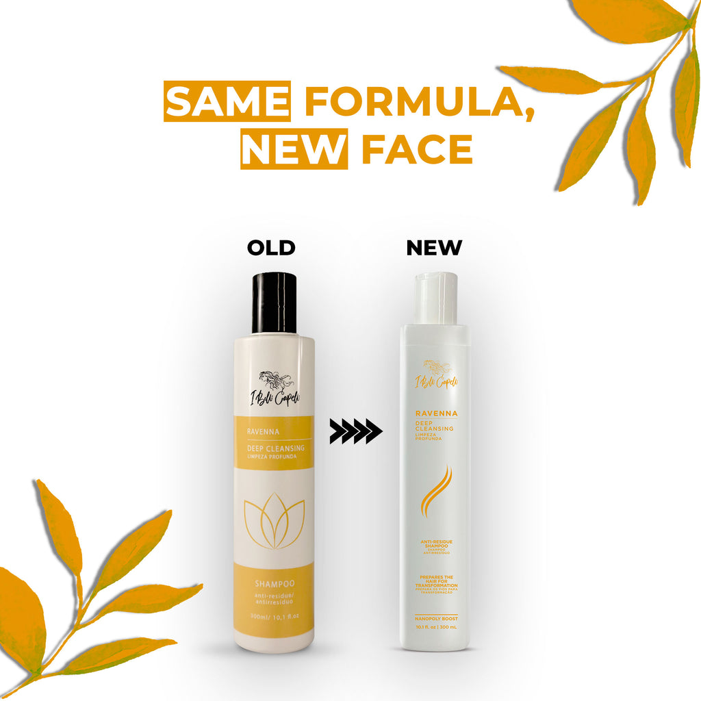 Champú Anti-Residuos Ravenna: Este es suave y tiene la función de realizar una limpieza profunda en el cabello eliminando los residuos acumulados que dejan el cabello pesado, opaco y sin brillo, sin dañar el cabello.