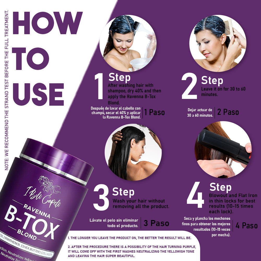 OBS: Para mejores resultados recomendamos el uso del Champú Anti-Residuos antes de usar Ravenna Blond Btox.