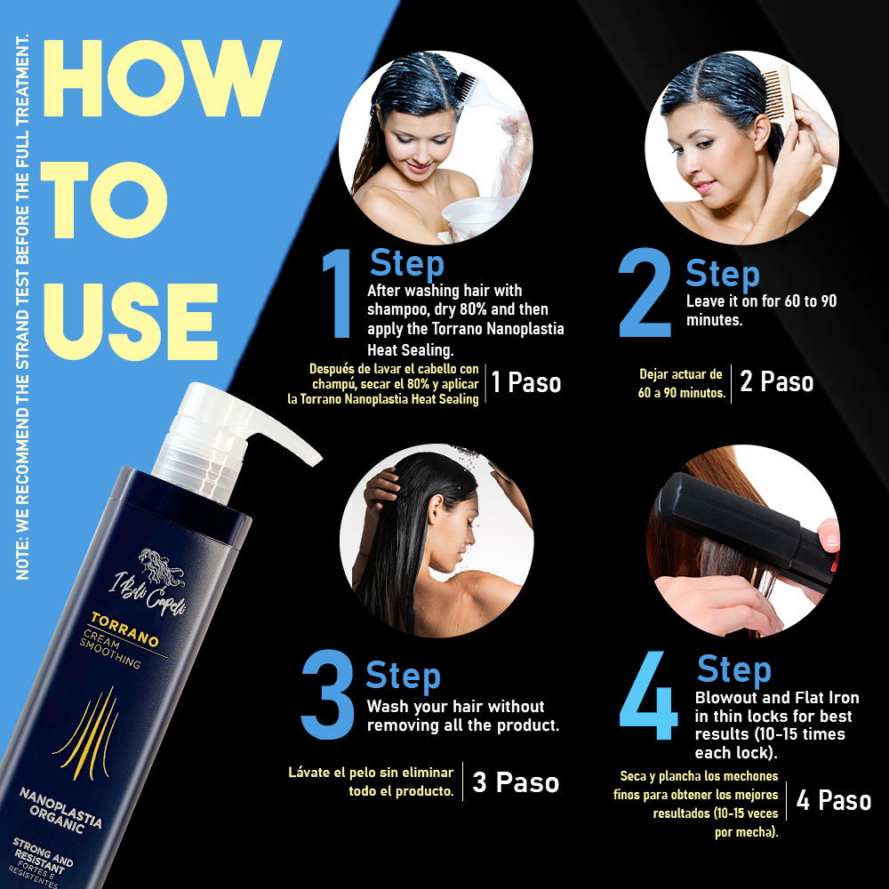 Aplicar Torrano Nanoplastia Organic en todo el largo del cabello respetando el cuero cabelludo. Déjalo actuar por 60 minutos aproximadamente (no excedas este tiempo), enjuaga el cabello (sin retirar todo el producto).